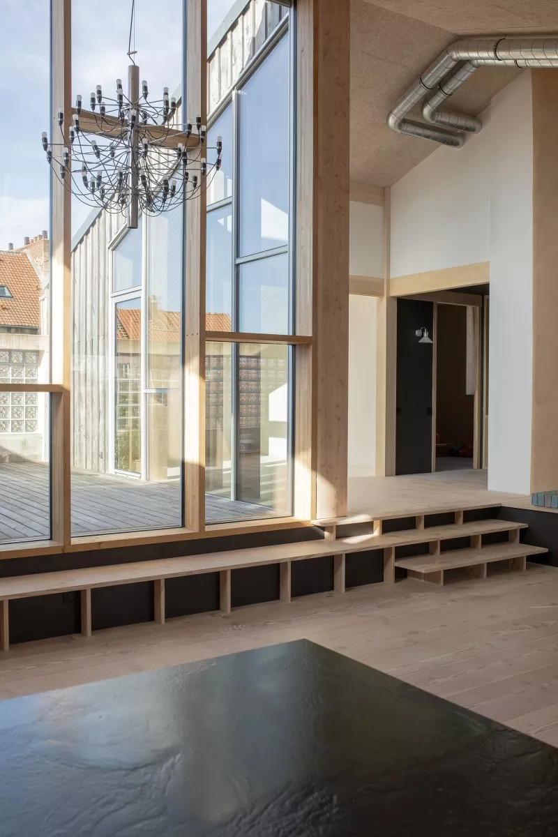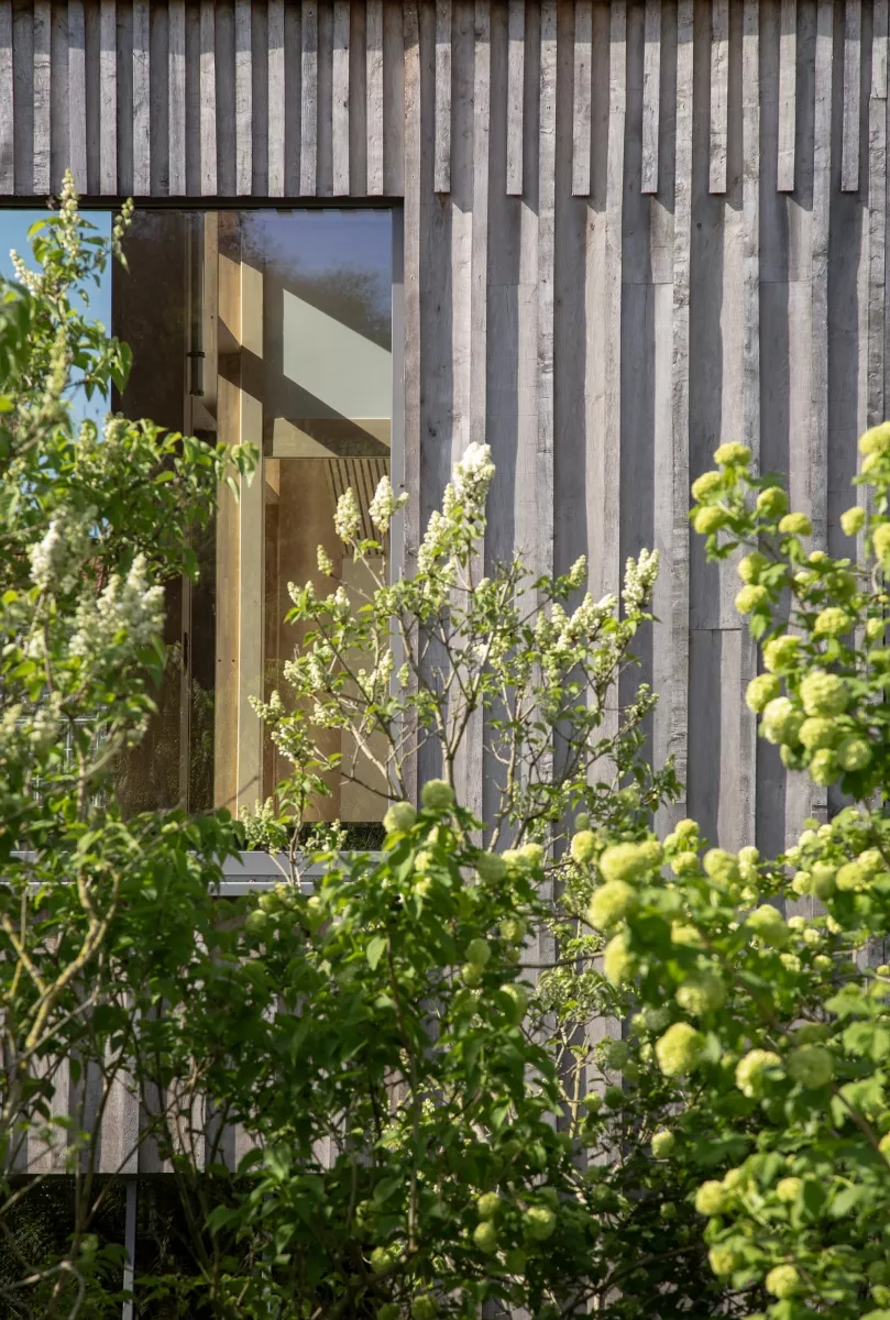 Chêne laméllé collé par Alglave / Peuplier des Hauts de France collé par FCB / Bardage en Chêne local, scierie Alglave, mise en oeuvre par EFITEK / Paille de chez Thierry Calais, Guines / Terre crue des Carrières du Boulonnais / Bâtiment intégralement alimenté en récupération des eaux pluviales par Celesto / Bois de chauffage de la forêt de Hubert Delattre, Wierre-effroy / Céramique (carreaux de sol, vasque, briques émaillées ) par Syl