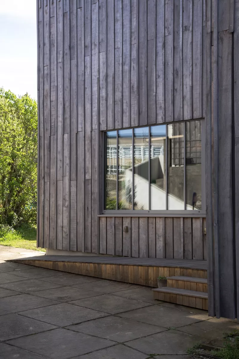 Pour notre agence et pour notre habitat, nous souhaitions prolonger notre démarche du local à travers une réhabilitation/extension d’un hangar béton existant. L’élévation en bois terre paille, compense les déperditions de l’agence située en RDC.